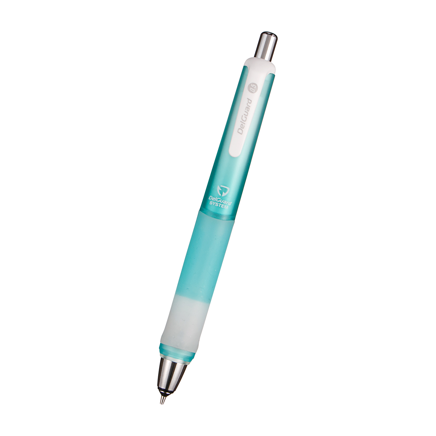一つ一つ丁寧にシャープペンに装着していきます。 今回はデルガード用のジャケット「SMARTJACKET DL01」を装着してみました。 まず、上部分のパーツ2にデルガードを通します。 クリップ部分を固定するように上から小さなパーツ3を装着します。 装着部分 デルガード (DelGuard) 芯を守る。 ずっと書ける。 筆記中の、あらゆる角度のどんなに強い筆圧からも折れないように芯を守ります。 紙面に対し、垂直に強い筆圧が加わると、軸に内